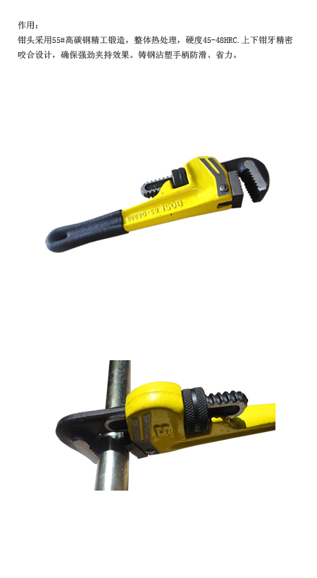 鉗頭采用55#高碳鋼精工鍛造,整體熱處理,硬度45-48HRC.